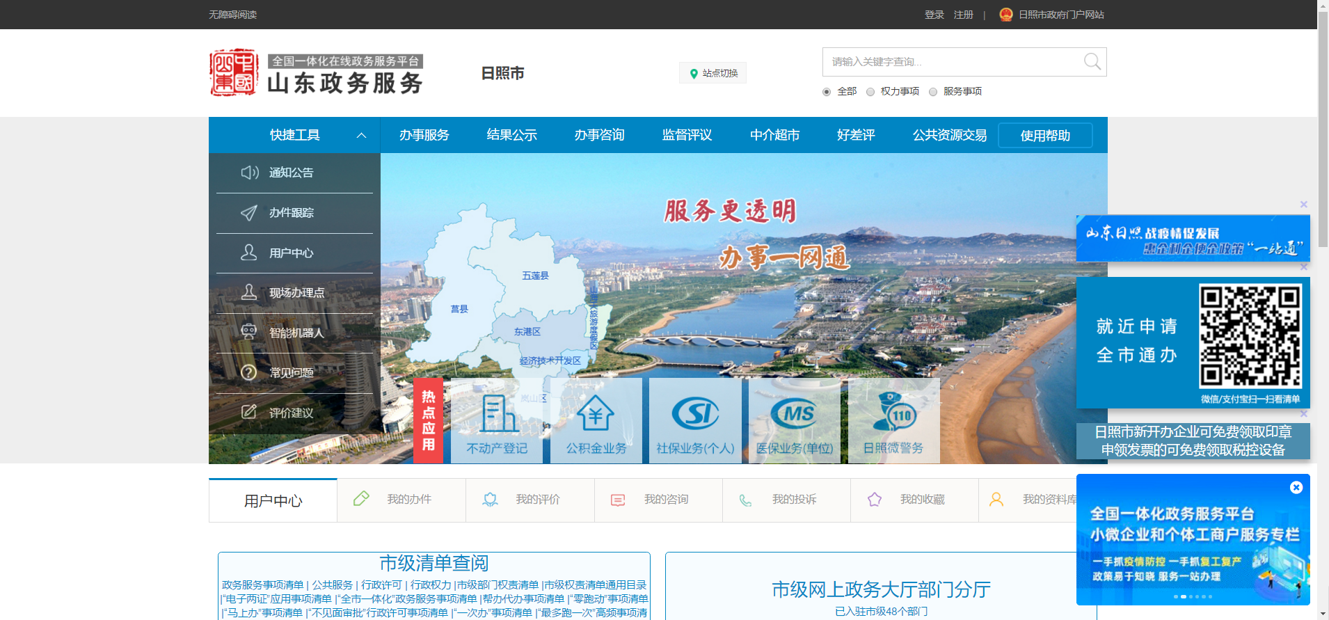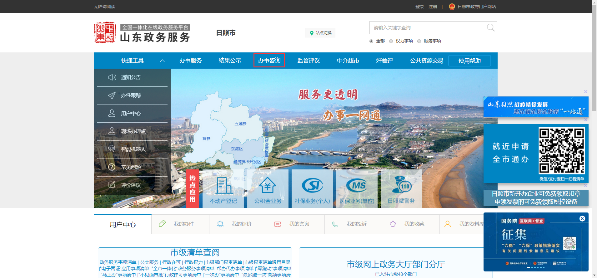 1.在山东政务服务网(日照站)点击“办事咨询”模块。
