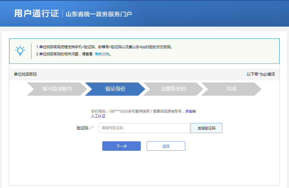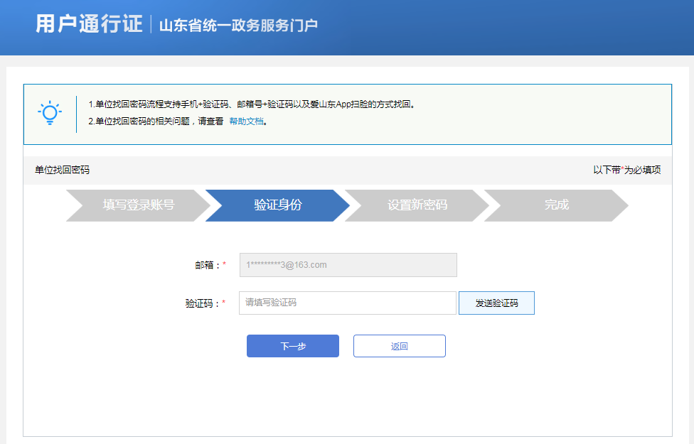 3. 在验证身份环节涉及到三种验证方式:手机号+验证码方式、邮箱+验证码方式、爱山东APP扫脸认证。