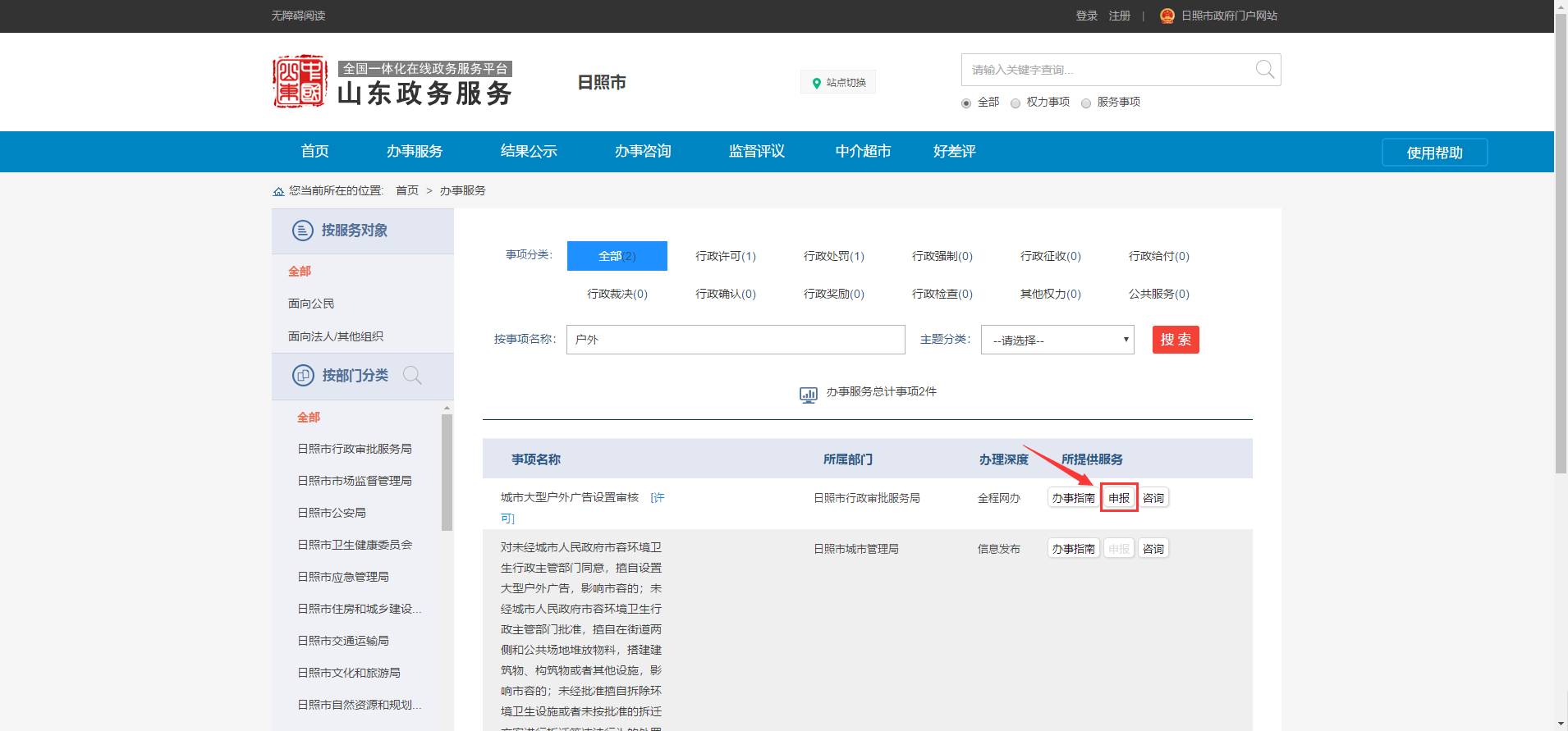 1.在山东政务服务网(日照站)点击“结果公示”模块。