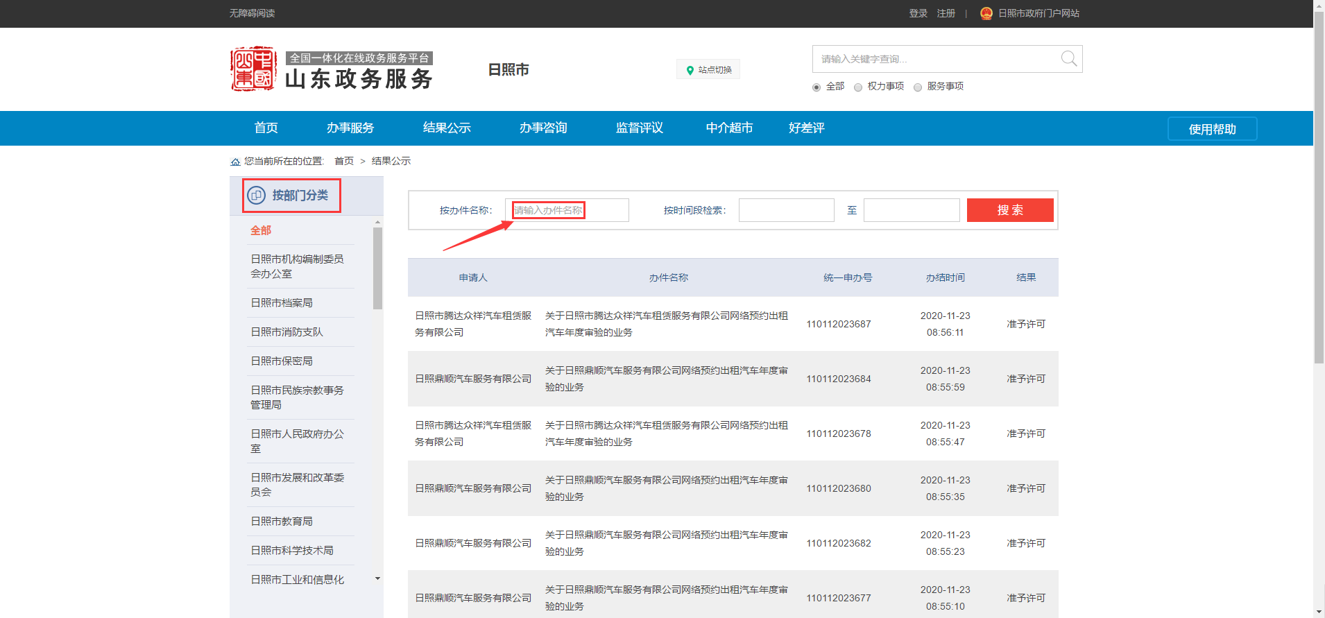 2.在“结果公示”页面,在左侧“按部门分类”中查找该事项所在的部门,在办件名称框中直接输入办件名称进行查找。